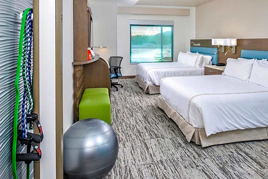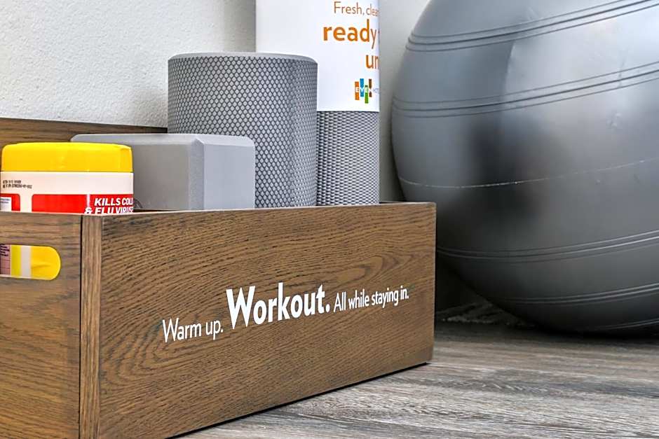 This double room features fitness equipment including medicine balls, yoga mats, and resistance bands, along with in-room fitness training videos and exercise guides. Additional offerings include a mini refrigerator, work desk, and a choice of pillows and cool eucalyptus linens.